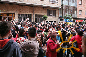 Está claro que se necesita agua, pero de haberse retrasado tan sólo un día el Catapán hubiese lucido bastante más. Aun en estas circunstancias, todo Soria se tiró a la calle para hacer la ruta del bacalao, del queso y como no, del vino. Este año elegimos la cuadrilla Santa Bárbara para asistir al cambio de bastón, pues entre otras cosas nuestro estudio pertenece a la cuadrilla. Todo fue sobre ruedas, pues aunque los nervios hacen que las voces titubeen, el calor y la cercanía del público logran restaurar la fluidez en las palabras. El momento más emotivo lo ofreció el jurado entrante, recordando a los que ya no están, pero nos acompañan desde algún lugar.