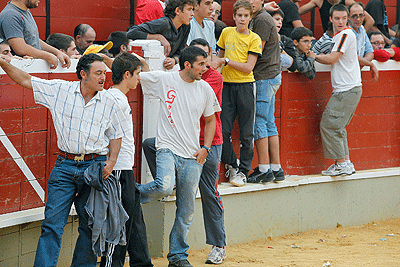 Este es uno de los eventos que no pierde público de año en año. Es más, este año acompañado por el buen tiempo, la plaza estaba casi repleta. La dinámica la de siempre, barrera cuadrada en el centro de la plaza, panel móvil, pollo asado a los que cojan la maderita que se encuentra dentro del balón de papel que le ponen a la vaquilla al salir, y calimocho colgado en un barril con goma, donde antiguamente había vino, y que no se si por ese motivo, por que está disipado, o por la dichosa gripe A pero cada vez tiene menos adeptos.