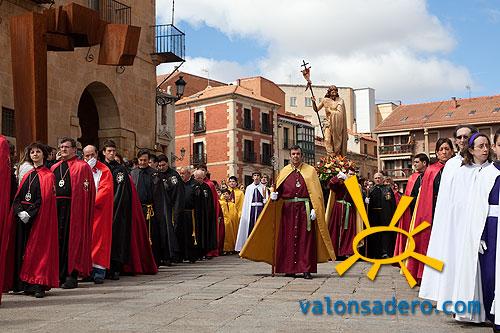 A las 11:15 de la mañana salió de la Iglesia de El Salvador la imagen de la Virgen de la Alegría ataviada con la mantilla negra en señal de luto. A la misma hora salió de la Concatedral de San Pedro la imagen de Jesús resucitado. A las 12:00 de la mañana tubo lugar el encuentro de ambos en la plaza Mayor.
