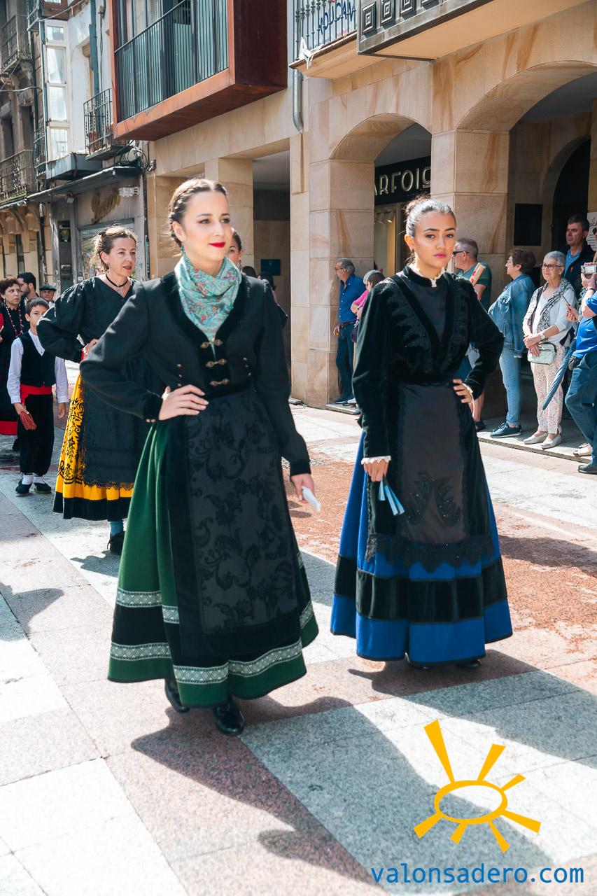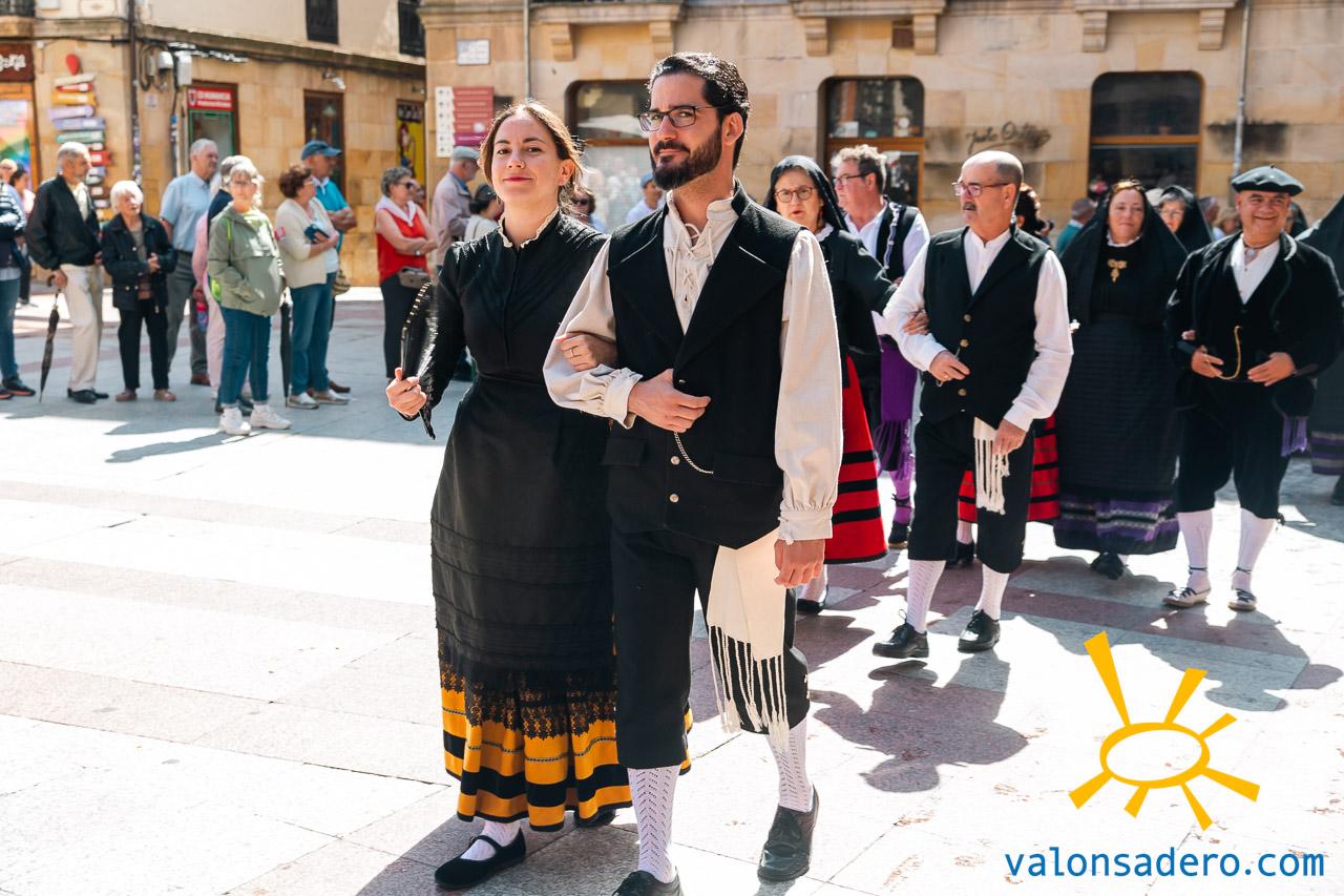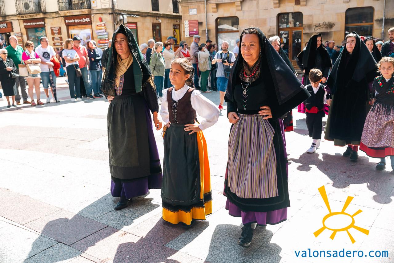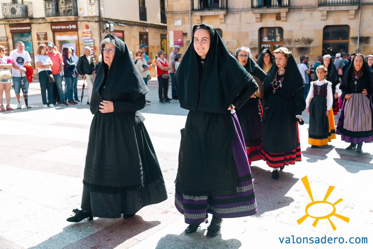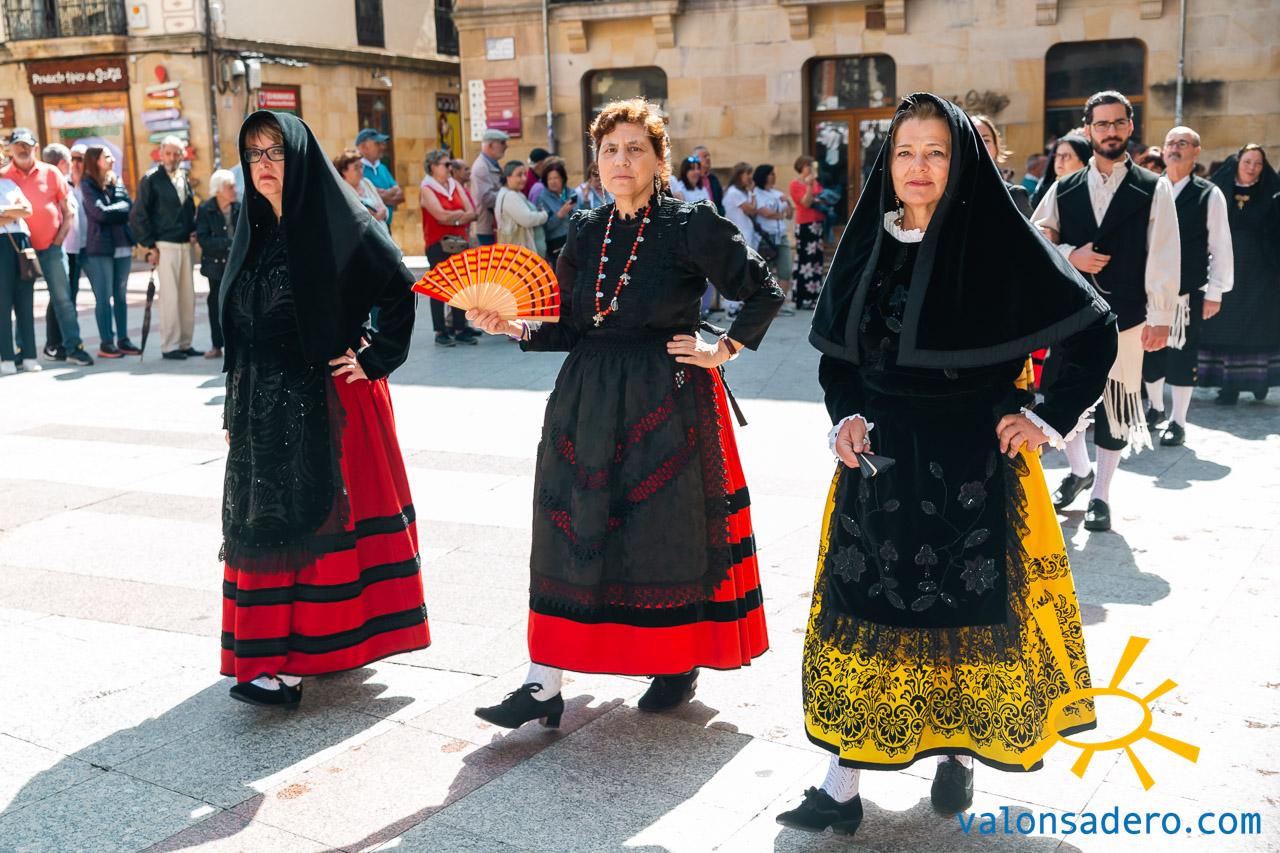 Las piñorras tuvieron que cambiar sus abanicos por paraguas en este lluvioso Lunes de Bailas 2023. Fotos S. de Miguel